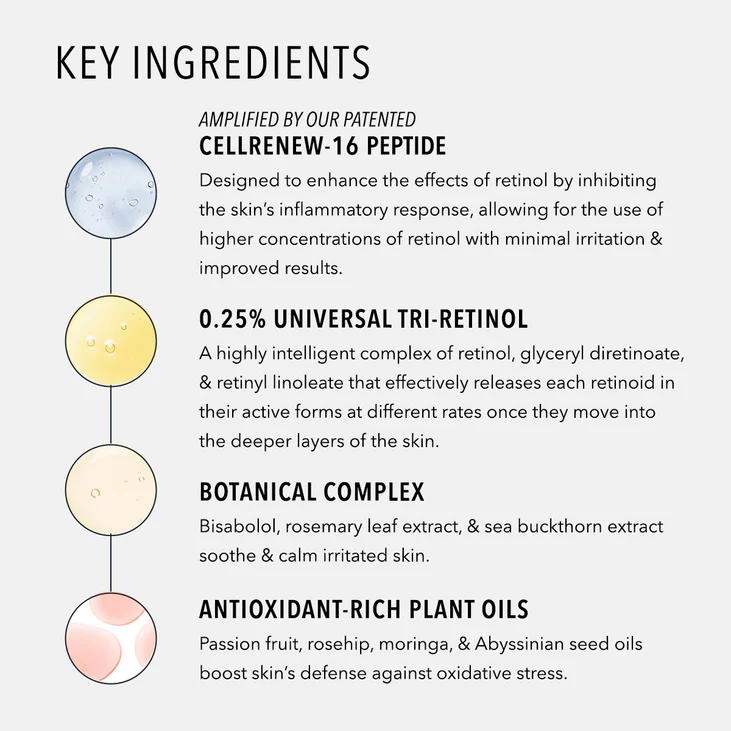 Featuring our proprietary CellRenew-16 peptide technology and an advanced triple retinoid complex, this unique oil-based serum provides a nourishing retinol experience that’s as gentle as it is highly effective, accelerating the skin’s turnover process without triggering inflammation.
