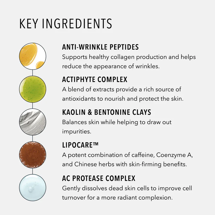 This multi-tasking face mask uses purifying clays to clear impurities while minimizing the appearance of pores, while peptides address the appearance of wrinkles and an advanced complex provides an immediate visible lift.